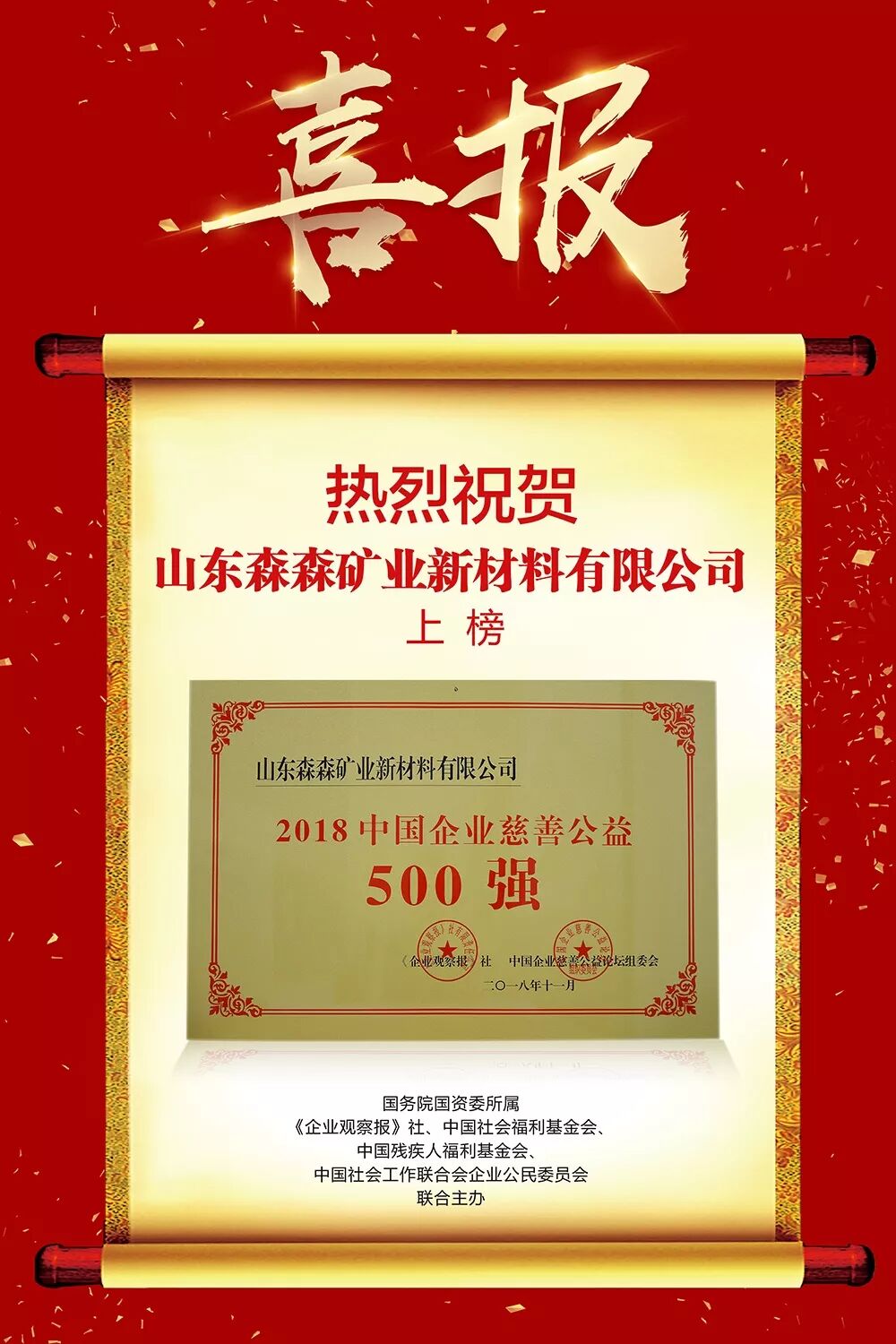 日前,2018中国企业慈善公益500强发布暨第二届中国企业慈善公益论坛在北京会议中心召开,山东森森矿业新材料有限公司荣获“2018中国企业慈善公益500强”。