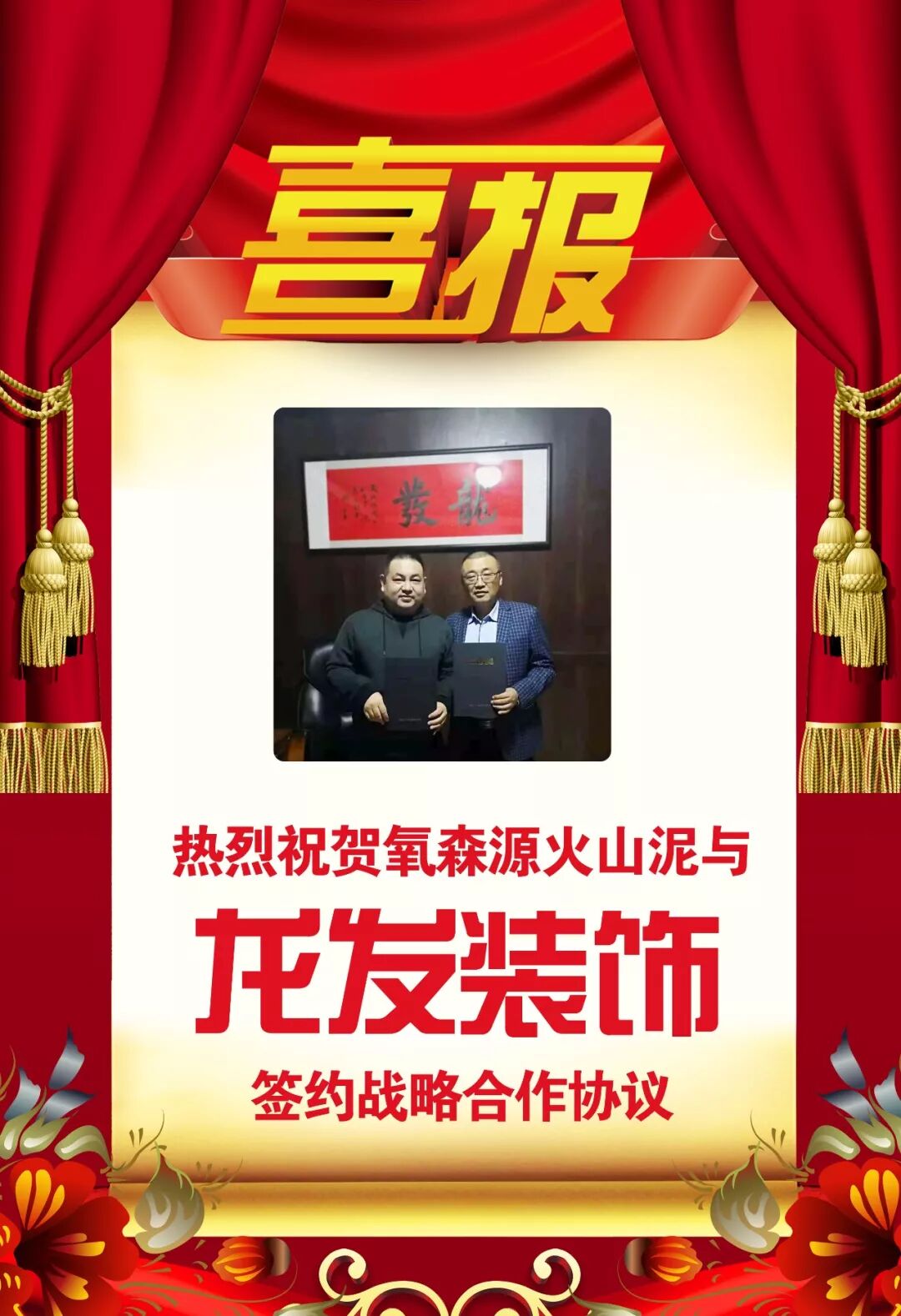 喜报!热烈祝贺氧森源火山泥与家装行业十强品牌龙发装饰签约战略合作协议,实现双方共同发展。